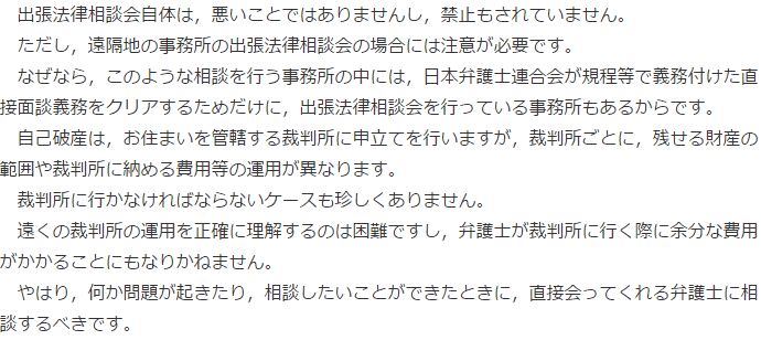 自己破産を行うにあたっては,やはり相談先をしっかりと検討した方がよいかと思います。よく検討しないまま選んでしまうと思わぬ不利益が生じることがありますし,後悔してしまう結果になってしまうこともありえますので,ご注意ください。